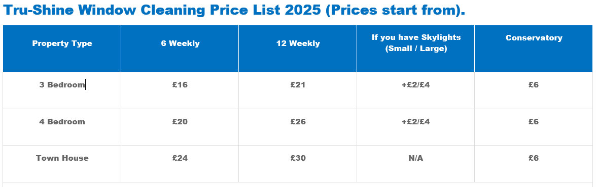 These prices are based on a Terrace house with straight forward access to rear of property. For your first initial clean, we charge an extra 50% on regular price, Please forward photos when emailing, this will give you a price quicker trushineservicesltd@gmail.com