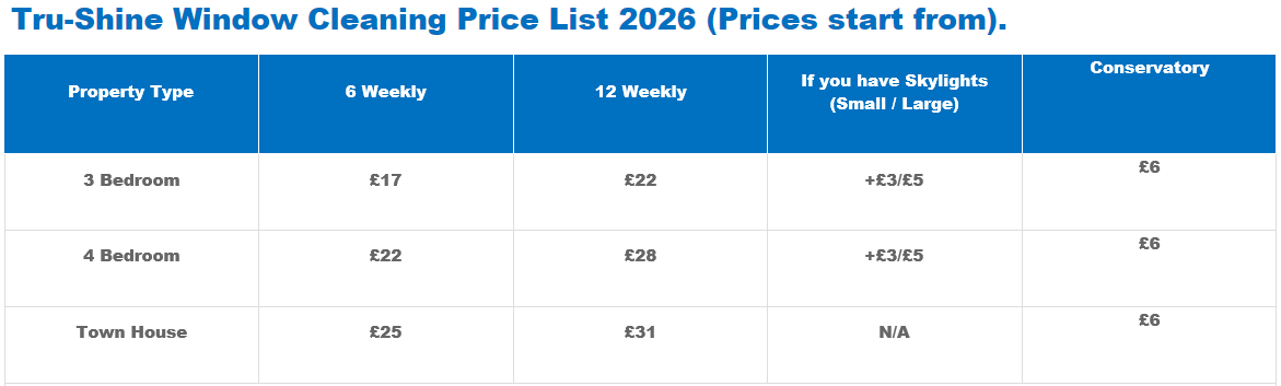 Please forward photos when emailing, this will give you a price quicker trushineservicesltd@gmail.com These prices are based on a Terrace house with straight forward access to rear of property. For your first initial clean, we charge an extra 50% on regular price.